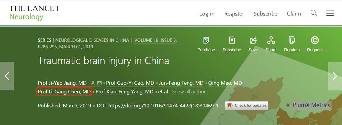 2019年2月13日,作为第二主研单位(上海交通大学医学院附属仁济医院为第一主研单位),beat365官网附属医院陈礼刚教授参加编写的题为《中国颅脑创伤》的长篇论文在世界神经科学排名第一的《柳叶刀神经病学》杂志(影响因子27.138分)在线发表。