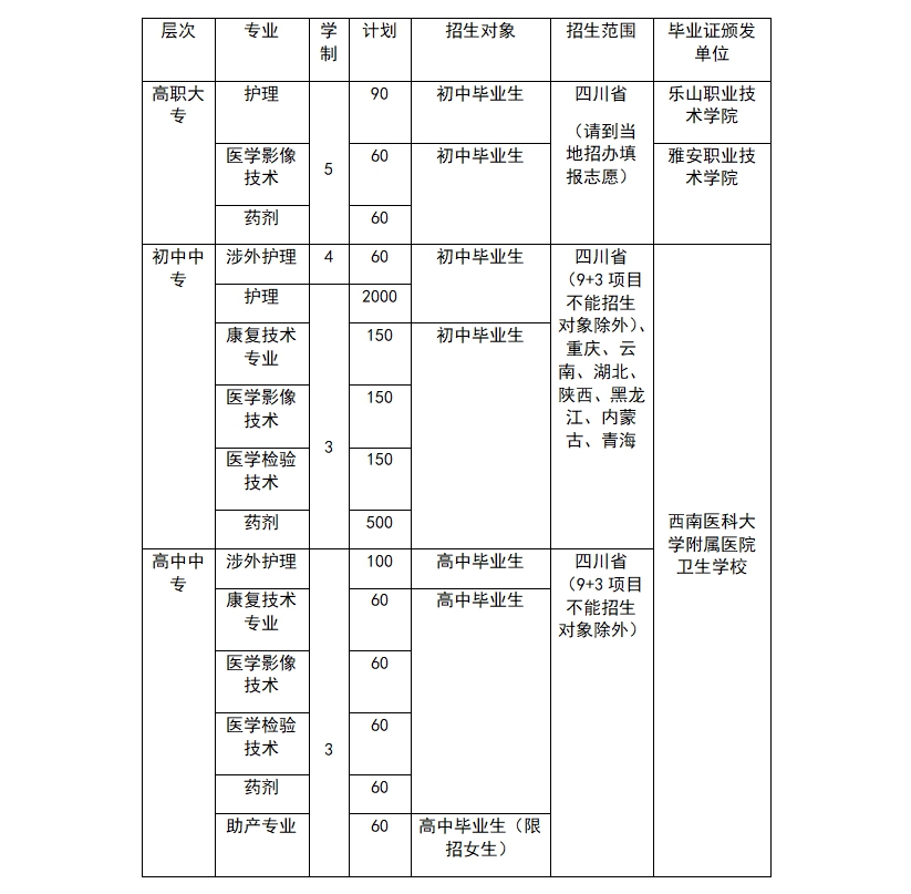 五年高职: 54011(直升转录高校:乐山职业技术学院);54911(直升转录高校:雅安职业技术学院)