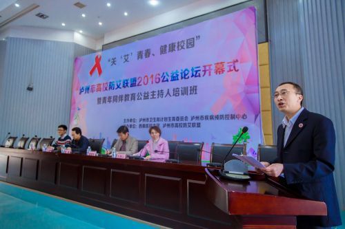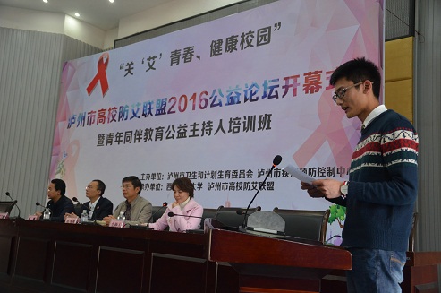 3月25日下午,由泸州市卫计委、市疾控中心主办,beat365官网承办的“关‘艾’青春、健康校园”泸州市高校防艾联盟2016公益论坛开幕式暨青年同伴教育公益主持人培训班在beat365官网城北校区隆重举行,来自beat365官方网站、四川警察学院、四川化工职业技术学院、四川三河职业技术学院、泸州职业技术学院、泸州广播电视大学6所高校及泸州职业技术学校的老师和学生代表300余人参加了此次公益论坛开幕式。