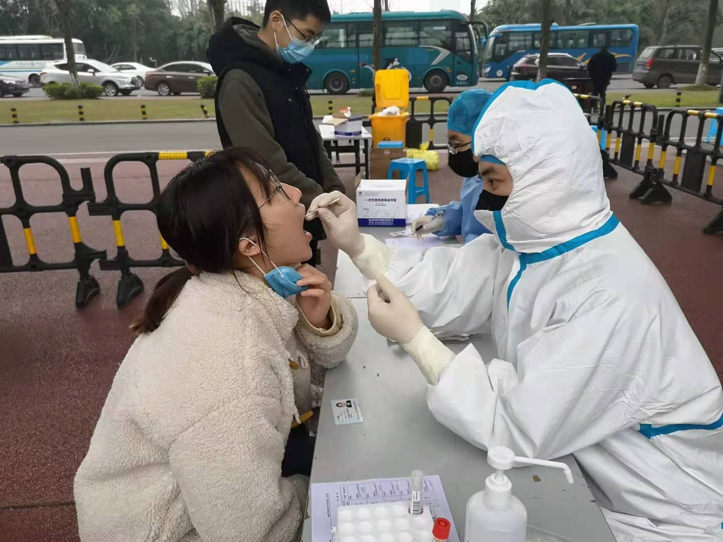 本次核酸检测成立了名单收集组、核酸采样组、条码打印组、后勤保障组、秩序维护组等工作小组。各组分工明确,提前做好通知学生错峰采样、名单收集、条码打印和物资准备等工作。采样当天,学生戴好口罩间隔一米排队、测体温、登记、采样、送检等工作井然有序,学生即采即走。据统计,当日城北校区完成采样575人次,忠山校区完成采样349人次,两校区均提前圆满完成了采样任务,学校附属医院及附属中医医院将于28日上午为学生们出具核酸检测结果。