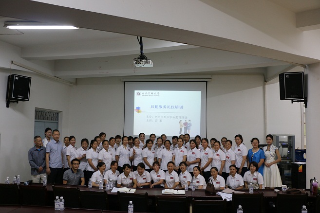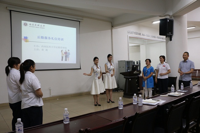 6月14日上午,后勤管理处在基础医学院会议室举行服务礼仪专项培训活动,后勤公寓中心45名宿舍管理员及饮食中心11名餐饮服务员参加了培训,本次活动特邀法学院党总支副书记黄莉现场培训授课。
