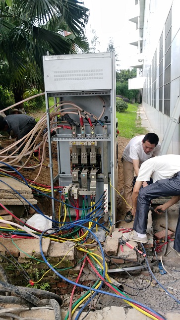 5月22日,城北校区海川楼供电系统改造项目开始施工,在保证工程质量和安全的前提下,后勤管理处从减少海川楼、18-24舍停电时间的角度考虑安排,要求施工方利用端午节放假期间加班加点进行施工。在能源管理中心与施工方相关人员的配合下,利用柴油发电机给食堂供电、临时电缆给18-24舍供电,在一方面保障供电一方面进行施工的情况下,完成了图书馆变压器搬迁、新安装低压柜等施工难度比较大的任务。截至6月14日,城北校区海川楼配电房供电系统改造项目施工已基本完成。