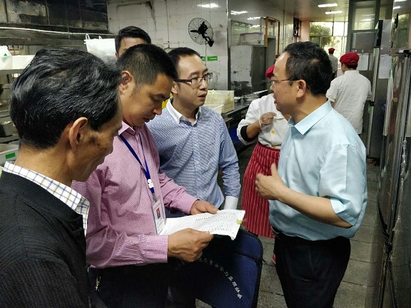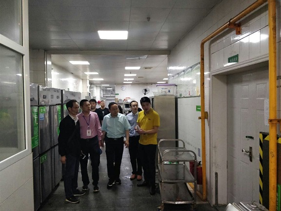 日前,龙马潭区食品药品监督管理局餐饮股股长彭正清一行检查beat365官网食堂工作,教辅后勤党总支书记、后勤管理处副处长陈家良陪同检查。