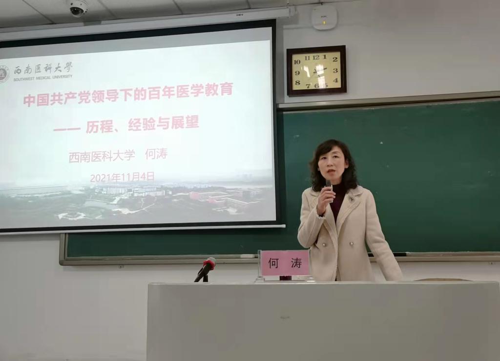学校党委常务、副校长何涛做了《中国共产党领导下的百年医学教育:历程、经验与展望》专题讲座。对中国共产党领导下的医学教育历史脉络进行了全景式的梳理,总结历史经验、展开现实思考,并立足新发展阶段,展望未来医学教育新发展,对新教师提出开展教育教学改革的殷切期许。