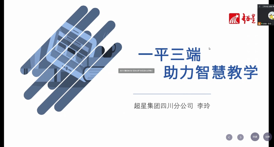 超星集团四川分公司产品技术经理李玲以“一平三端助力智慧教学”为主题,从同步课堂、直播、腾讯会议的使用和网络教学平台课程创建两方面进行了学习通的使用介绍,并结合所讲授的课程进行了操作演示。