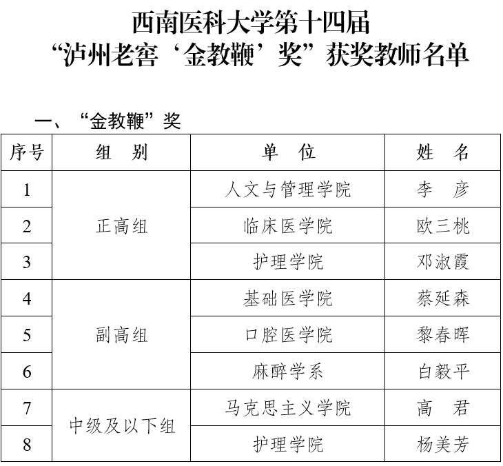 近日,学校第十四届“泸州老窖‘金教鞭’”奖评审工作收官。经过数月多轮严格评审,最终评选出“金教鞭奖”获奖教师8名、“金教鞭之星奖”获奖教师10名。