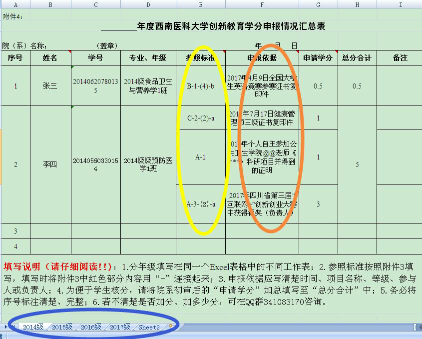 (一)统一格式,将统一专业不同年级录入在一个Excel表格内的不同工作簿并分年级标注清楚(示例见参考格式蓝色圆圈内内容);