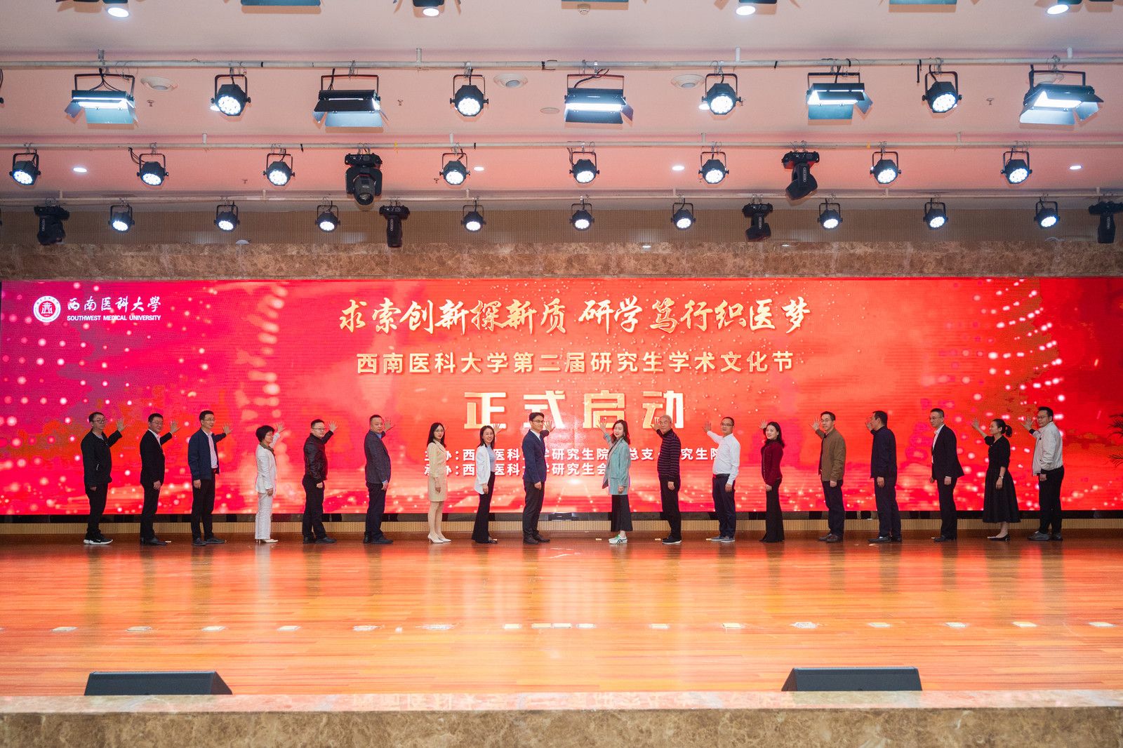 与会校领导、职能部门主要负责人、各二级院所分管领导共同启动beat365官方网站第二届研究生学术文化节并合影留念。
