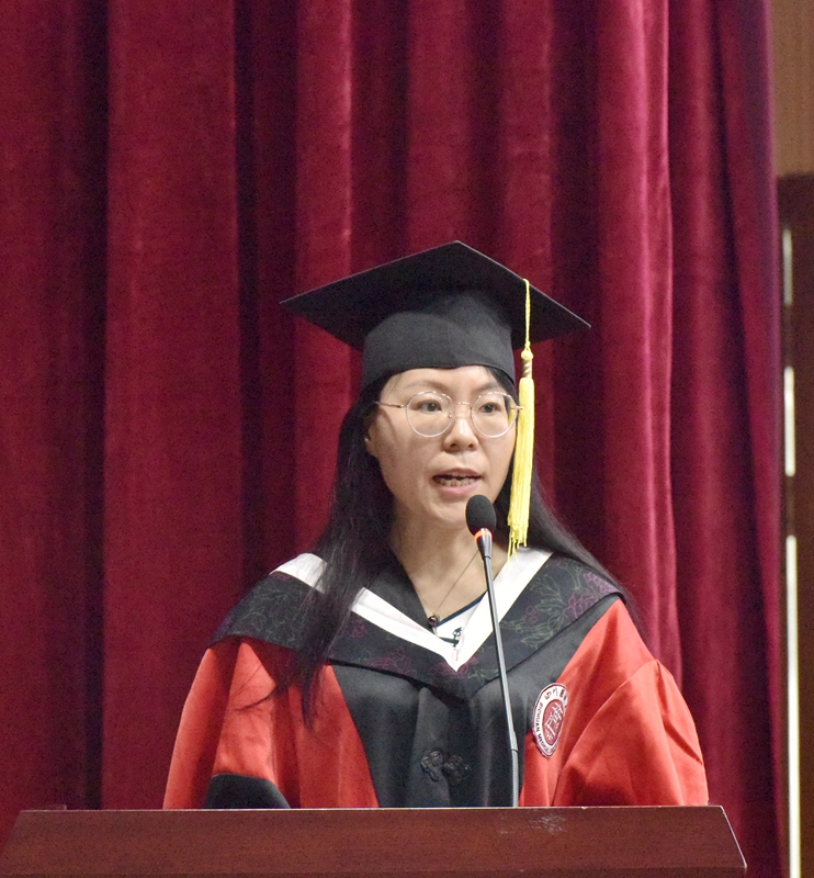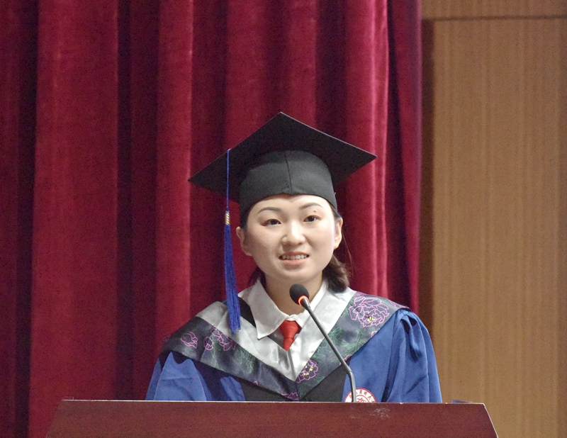 毕业硕士研究生代表王敏发言,表示作为医大学子,无论去向何方,有何际遇,必定时刻刻铭记母校栉风沐雨铸就的“厚德精业 仁爱济世”校训以及老师们的谆谆教诲。