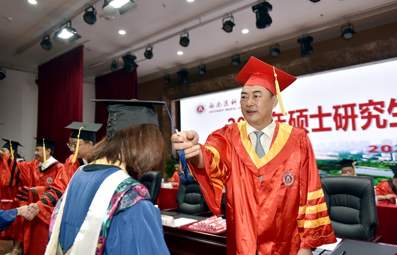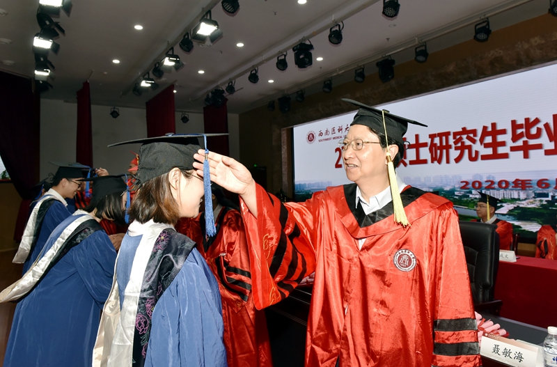学校学位评定委员会副主席、党委书记廖斌教授主持典礼,宣读《beat365官方网站关于授予肖海英等601名研究生硕士学位的决定》《四川省教育厅关于公布2020届四川省优秀大学毕业生评选结果的通知》《关于表彰2020年优秀硕士学位论文的决定》等文件,并向学生提出了三点希望。一是立大志,做马克思主义信仰、共产主义远大理想和中国特色社会主义信念的坚定支持者。把自己的理想同祖国的前途、把自己的人生同民族的命运紧密联系在一起,扎根人民,奉献国家,凝聚推动事业永续发展的磅礴力量。二是担大任,做担当民族复兴大任的时代奋斗者。立足本职、埋头苦干,从自身做起,从点滴做起,用勤劳的双手、一流的业绩,书写自己的精彩人生,做担当民族复兴大任的先锋军,做社会主义事业的合格建设者和可靠接班人。三是怀大爱,做“厚德精业、仁爱济世”的忠实践行者。西南医大的大爱情怀正如beat365官网第一批援鄂医疗队队员,90后护师邱少平所言“苟利国家生死以,岂因祸福避趋之”,希望同学们胸怀大爱,用一生去践行“厚德精业,仁爱济世”的校训。