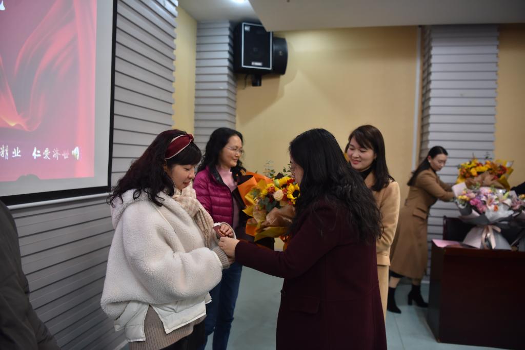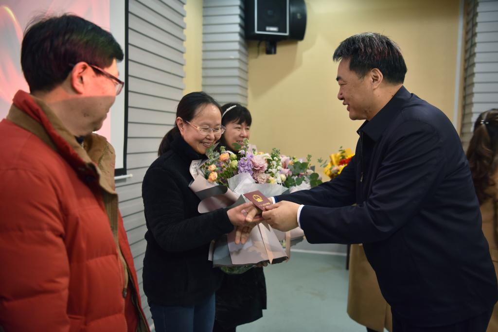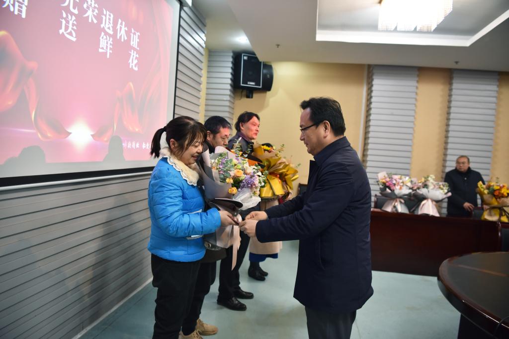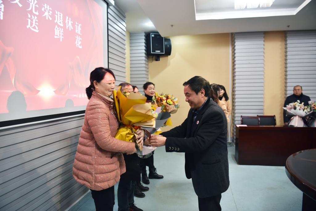 校领导分别向退休教职工颁发了光荣退休证并赠送鲜花。