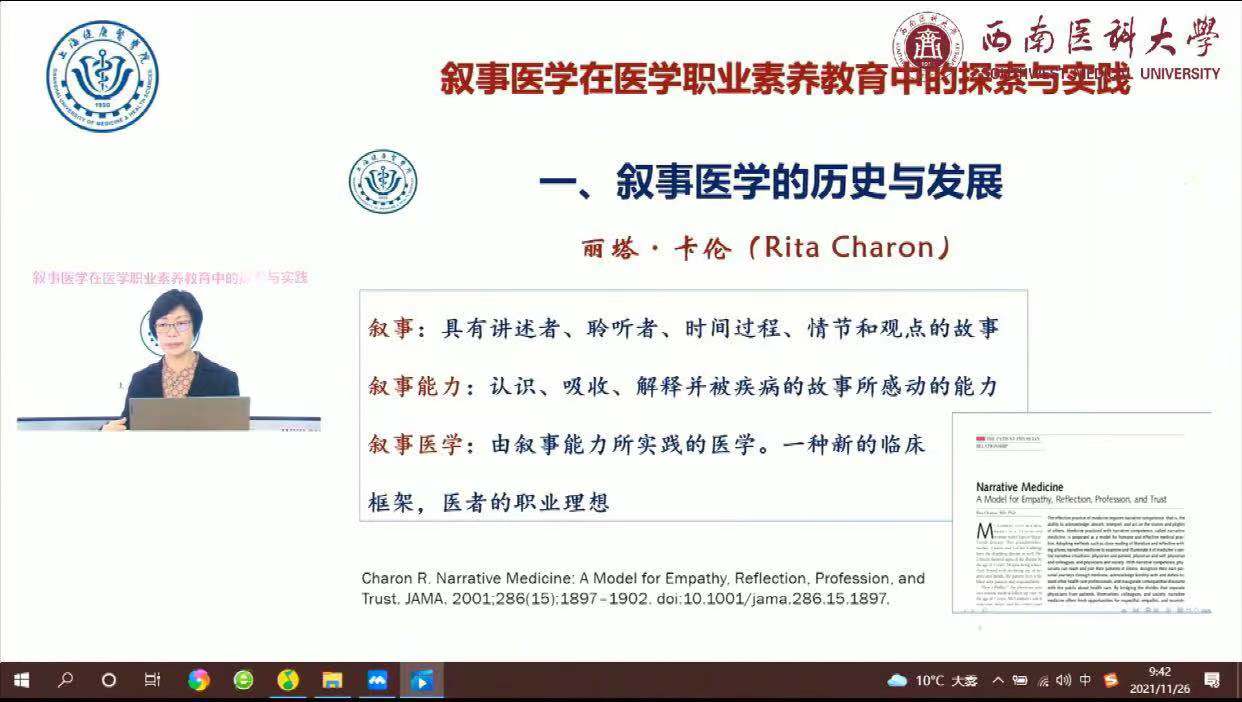 上海健康医学院临床医学院院长蔡巧玲教授作题为《叙事医学在医学职业素养教育中的探索与实践》的主题报告。她详细回顾了叙事医学的历史与发展,生动介绍从贯穿全程的“叙事医学”医学人文教育体系的构建-教学实践-阶段总结-系统反思,以及开展以医学生为主体、以能力为导向的叙事医学的探索与实践,并结合我国已经开展多种形式的叙事医学实践为例,分享了自己对叙事医学发展的思考和展望。