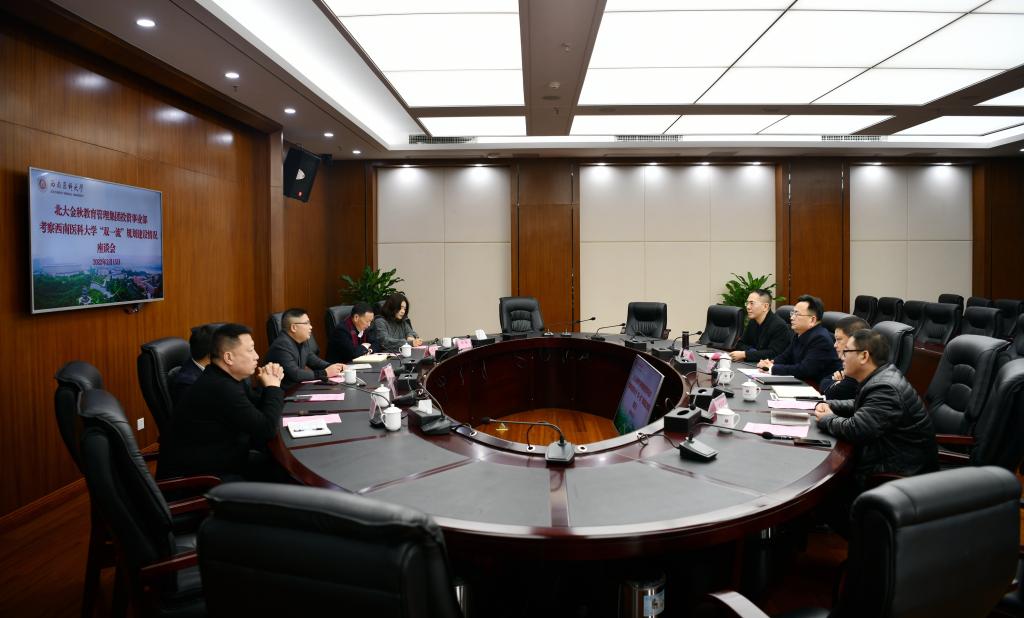 近日,北大金秋教育管理集团投资事业部邹洪波总经理一行5人到beat365官网考察“双一流”规划建设情况。座谈会在城北校区德诚楼一会议室举行,学校党委副书记、校长张春祥,泸州市教育和体育局机关党委书记匡子兵参加了座谈。会议由发展规划处处长赵领主持。