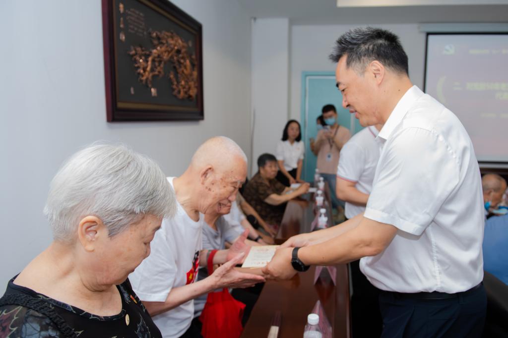 在慰问过程中,学校领导为2022年党龄达到50周年的老党员代表颁授了纪念章,集体过了政治生日,带领大家重温了入党誓词,并送上深情祝福和慰问金。同时,慰问组还与老党员、困难(重病)党员们话家常、聊近况,细心询问他们的健康状况、家庭生活等情况。