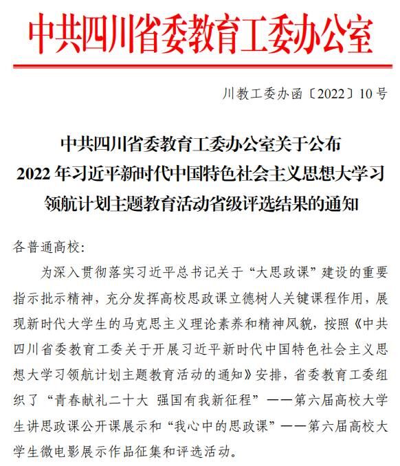 近日,四川省委教育工委公布2022年习近平新时代中国特色社会主义思想大学习领航计划主题教育活动省级评选结果,beat365官网获得6项荣誉,其中,“我心中的思政课”微电影作品获奖2项,“大学生讲思政课公开课”作品获奖3项,学校被评为“优秀组织高校”(全省仅十所高校获评)。