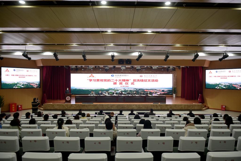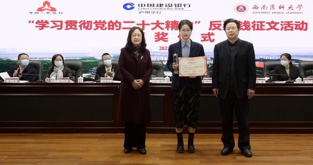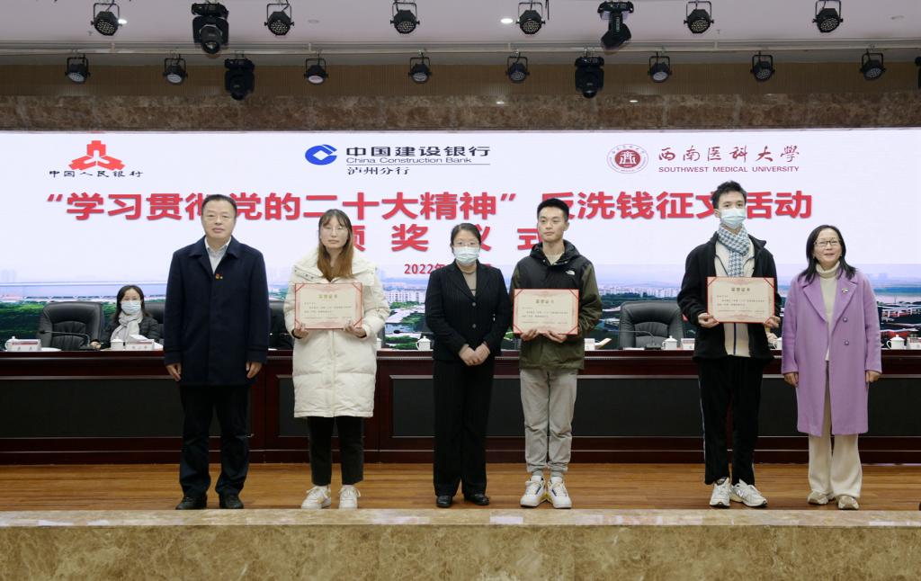 12月8日,“学习贯彻党的二十大精神”反洗钱征文活动颁奖仪式在beat365官网第一学术报告厅举行。中国人民银行泸州市中心支行党委书记、行长肖华轩,党委委员、副行长王岚,中国建设银行股份有限公司泸州分行党委书记、行长邹凌云,党委委员、副行长袁东;学校党委副书记刘毅,学生工作部副部长、团委书记石惠,研究生院党总支书记朱小平、学生工作部副部长易娟,法学院党总支书记廖女男及师生代表出席颁奖仪式。颁奖仪式由法学院院长罗刚主持。