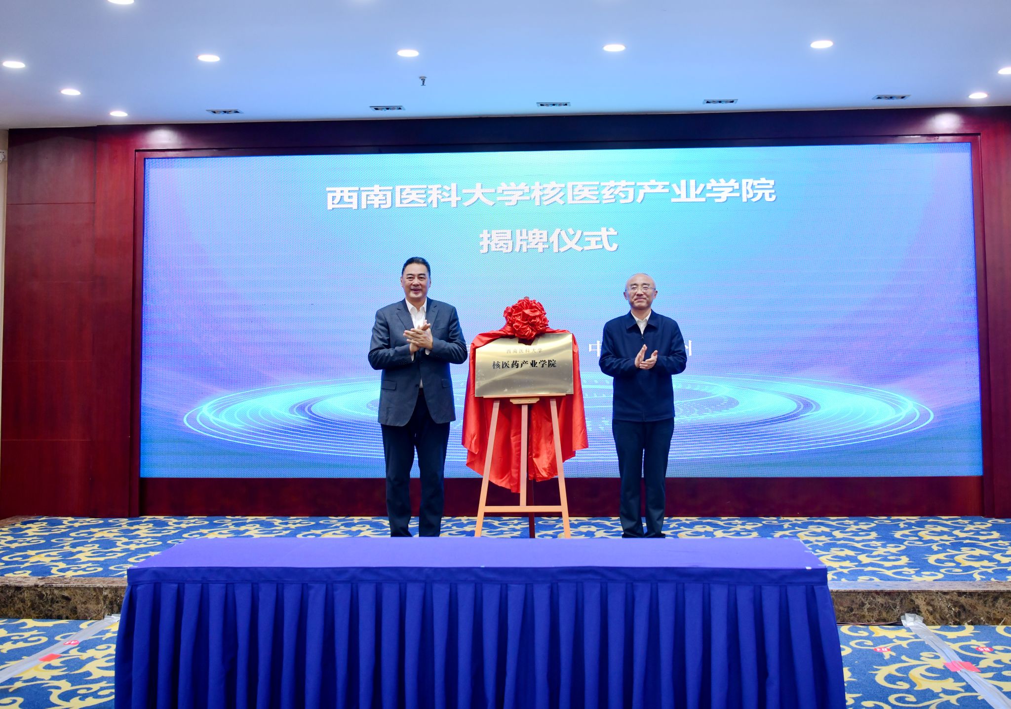 签约仪式上,廖斌与泸州市委常委、组织部部长曹斌为“beat365官方网站核医药产业学院”揭牌。