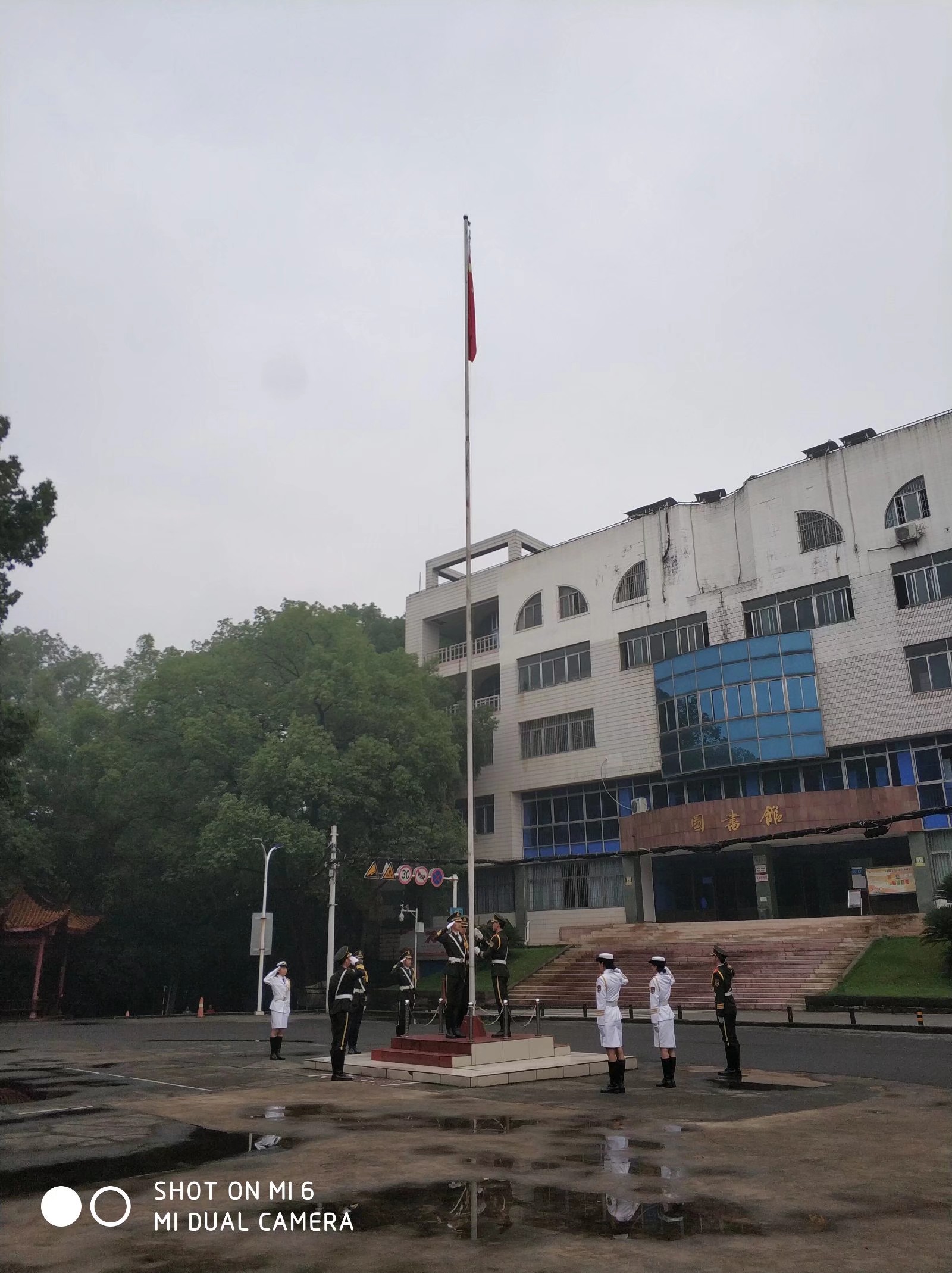 早6:40分,升国旗仪式正式开始,国旗仪仗队全体队员神采奕奕,迈着铿锵有力的步伐,护卫国旗来到国旗台前,“请全体肃立,升国旗,奏唱国歌!”在雄壮的国歌声中,鲜艳的五星红旗在城北奥体中心体育馆和忠山校区篮球场冉冉升起,高高飘扬在医大校园上空。