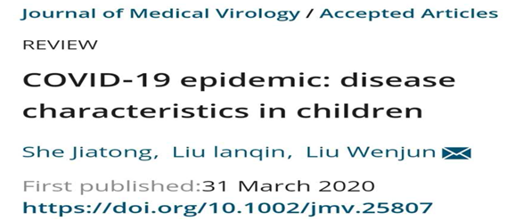 日前,儿科学系2019级本科学生佘佳桐,在儿科学系刘文君教授指导下以第一作者身份在SCI知名期刊Journal of Medical Virology上发表了题为“COVID-19 epidemic: disease characteristics in children”(DOI:10.1002/jmv.25807,2019 IF=2.049)的学术论文。该论文于2020年3月27日被Journal of Medical Virology杂志接收,4月1在线发表。