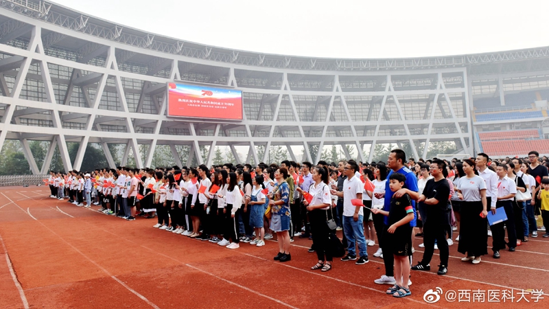 上午8:30,学校组织200名学生参加了泸州市庆祝中华人民共和国成立70周年升国旗仪式。西南医大学子身穿白大褂,与3000余名泸州社会各界代表齐聚四川警察学院足球场,唱红歌、升国旗,共同祝愿伟大的祖国生日快乐、祖国的未来更加繁荣昌盛。