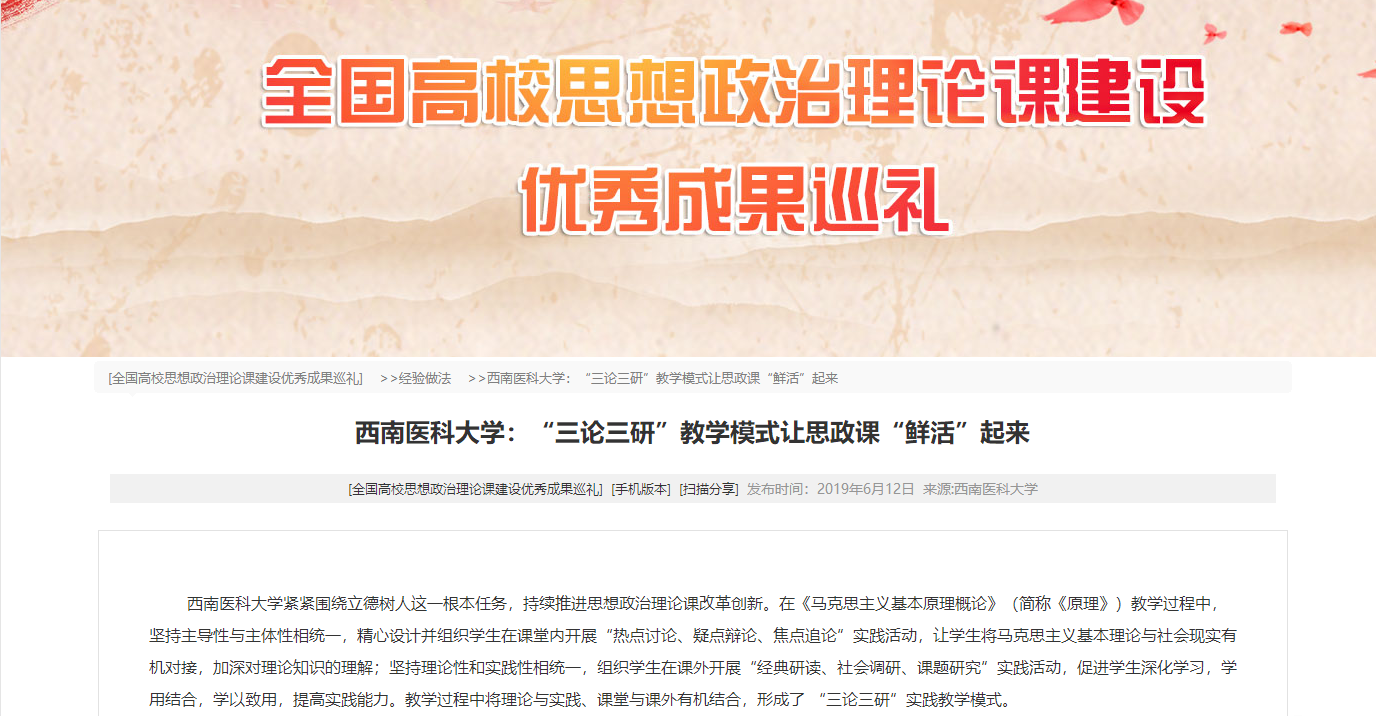 近日,beat365官网马克思主义学院马克思主义基本原理概论教研室教学成果《“三论三研”教学模式让思政课“鲜活”起来》在教育部开展的2019年全国高校思政课建设优秀成果巡礼活动中得到专栏展示。