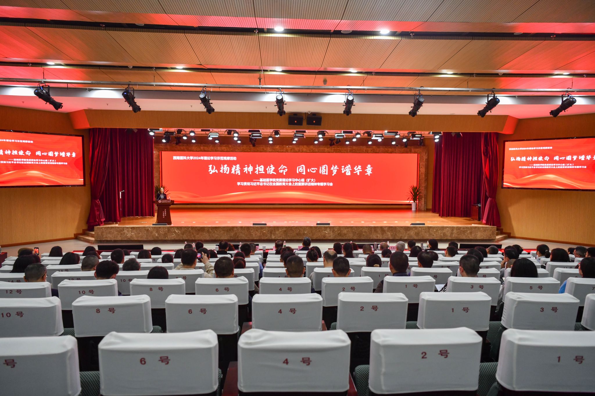 为学习贯彻习近平总书记在全国教育大会上的重要讲话精神,11月14日,学校2024年理论学习示范观摩活动在城北校区第一学术报告厅举行。本次活动以“弘扬精神担使命,同心圆梦谱华章——学习贯彻习近平总书记在全国教育大会上的重要讲话精神 ”为主题,由基础医学院党委理论学习中心组作示范学习。学校党委书记廖斌出席观摩活动,党委常委、副校长何涛以普通党员身份参加专题学习,党委常委、组织部部长柏珂,党委常委、宣传部·统战部部长冯天明以及各二级党组织负责人现场观摩,基础医学院党委理论学习中心组成员、院长、党支部书记、全体无课党员教师参加专题学习。会议由基础医学院党委书记阳静主持。