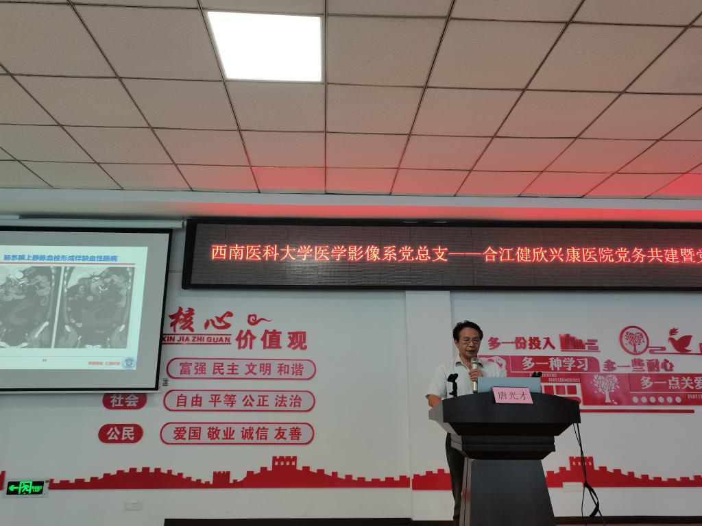 7月25日,医学院影像系党务共建暨党员科技服务下基层活动在合江健欣兴康医院举行。医学影像系党总支书记唐光才、系主任舒健带领党总支支委、支部书记、业务专家,为该院及部分乡镇卫生院临床医生、影像科室工作人员作了专题党课和学术讲座。活动由健欣兴康医院院长杨焱忠主持。