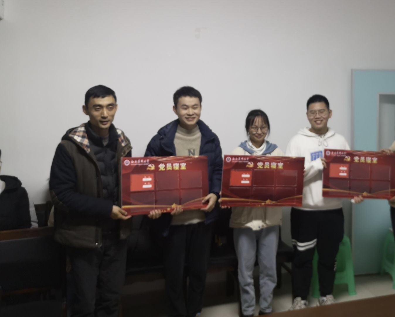 党支部书记裴宇对本次授牌仪式开幕致辞,对“学生党员寝室挂牌活动”提出了相关要求,强调了学生党员要亮出“身份”,时刻以党员的标准严以律己,在日常学习生活中率先起好先锋模范作用,潜移默化的去影响周围人,增强学生党员的使命感和责任感。最后,裴宇为每位学生党员寝室授牌并合影留念,希望学生党员能够带头创建温馨、和谐、融洽的宿舍氛围。