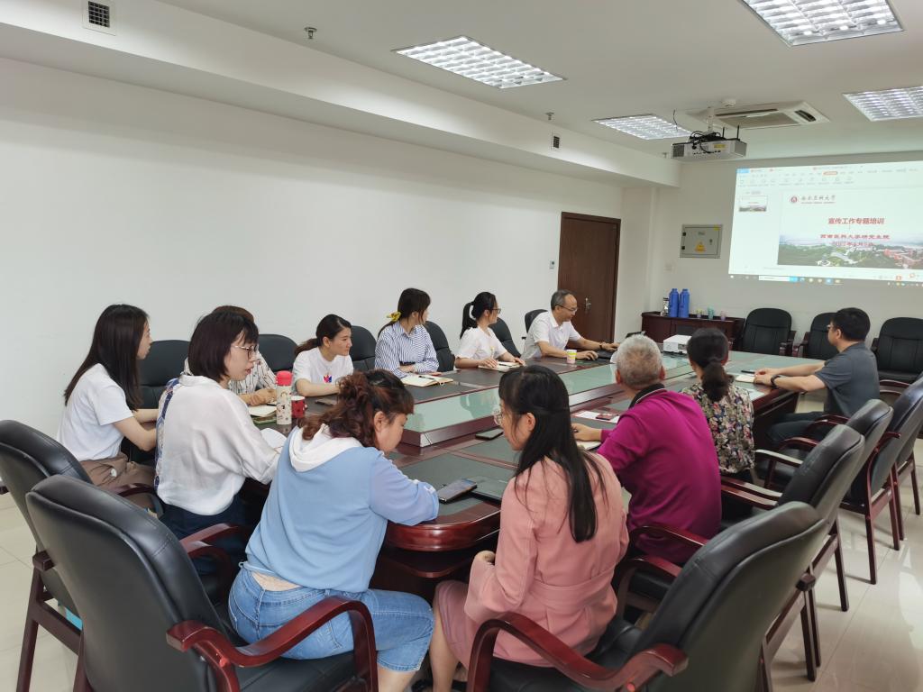 为进一步提升国研支部全体成员的党性修养和综合素质,全面加强宣传工作队伍建设,奋力做好学校宣传思想和文化建设工作,6月3日下午,国研支部邀请学校党委常委、宣传部部长、机关党委联系国研支部委员柏珂同志在德诚楼311会议室开展了宣传工作专题培训。国研支部10人和党外人士范贤明院长参与了培训,会议由国研支部书记朱小平主持。