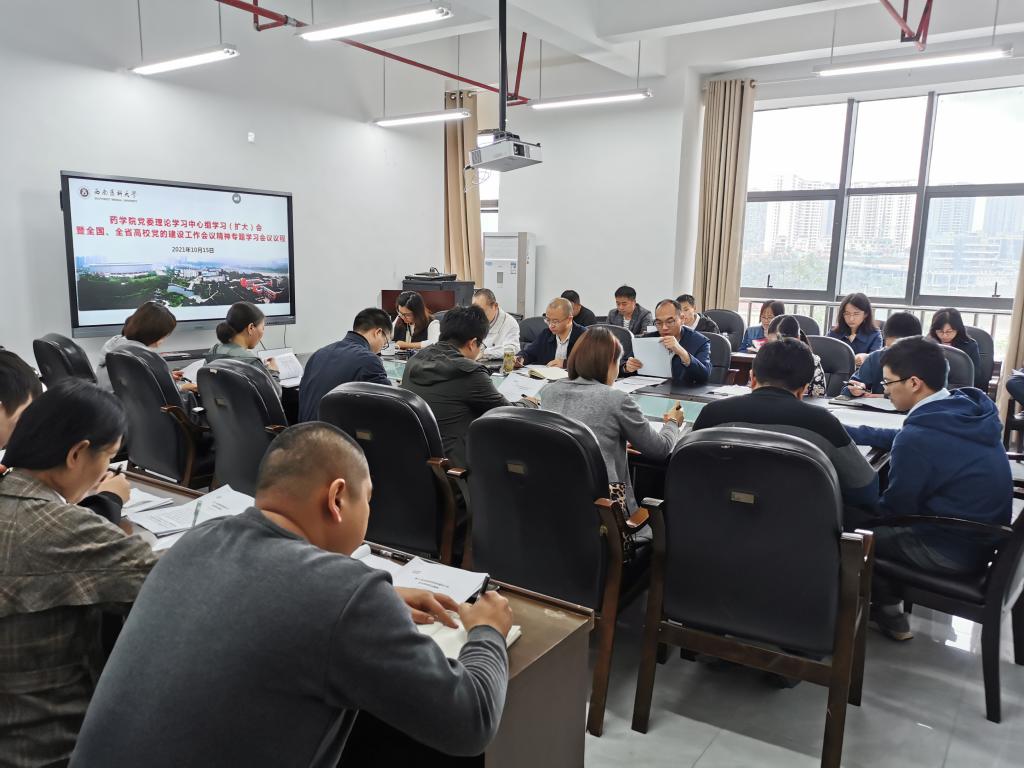 10月15日下午,药学院党委理论学习中心组召开中心组学习(扩大)会议暨全国、全省高校党的建设工作会议精神专题学习会议。药学院处科级干部,组织员,党支部书记、支部委员,教研室主任等参加会议。会议由药学院党委书记李祥主持。