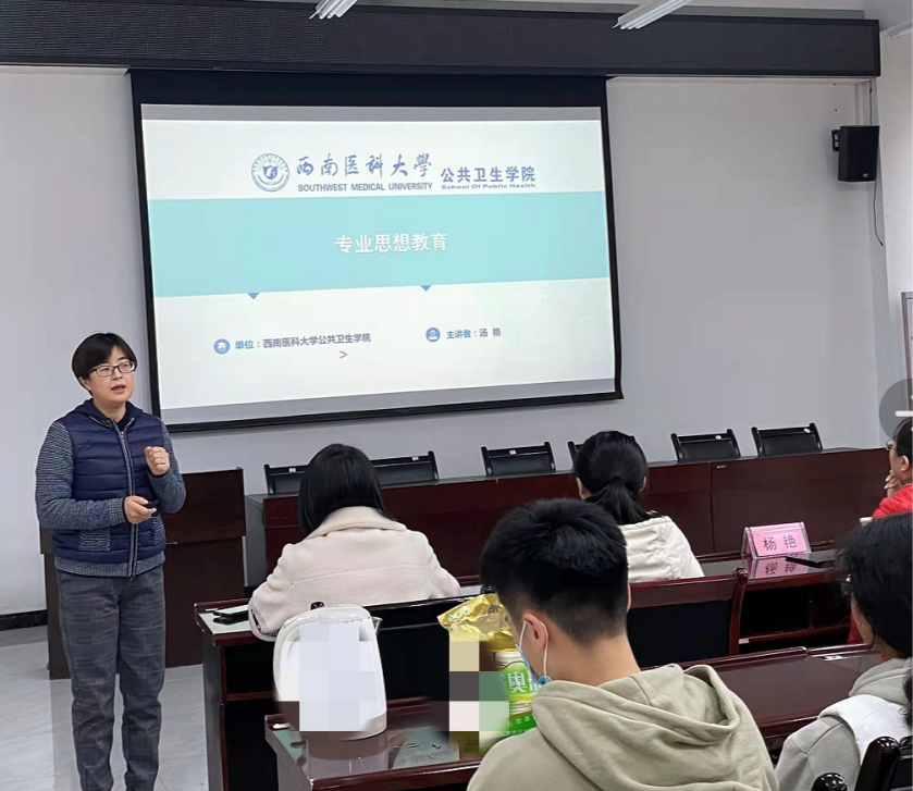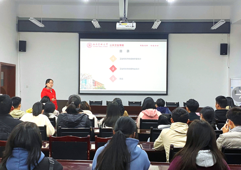 为了做好2021级卫生检验与检疫专业的思想教育和管理工作,加强学生的组织纪律观念,增强学生爱国爱校意识,促进校风、学风建设,使2021级新生了解并快速适应大学的学习和生活,增强自我管理、自我教育、自我服务和主动学习、立志成才的能力,11月16日下午,公共卫生学院副院长汤艳及卫生检验与检疫教研室主任杨艳以及教研室老师在仁济楼319会议室开展卫检新生专业思想教育讲座。讲座由兼职班主任刘静博士主持,2021级卫生检验与检疫专业全体新生参加了讲座。