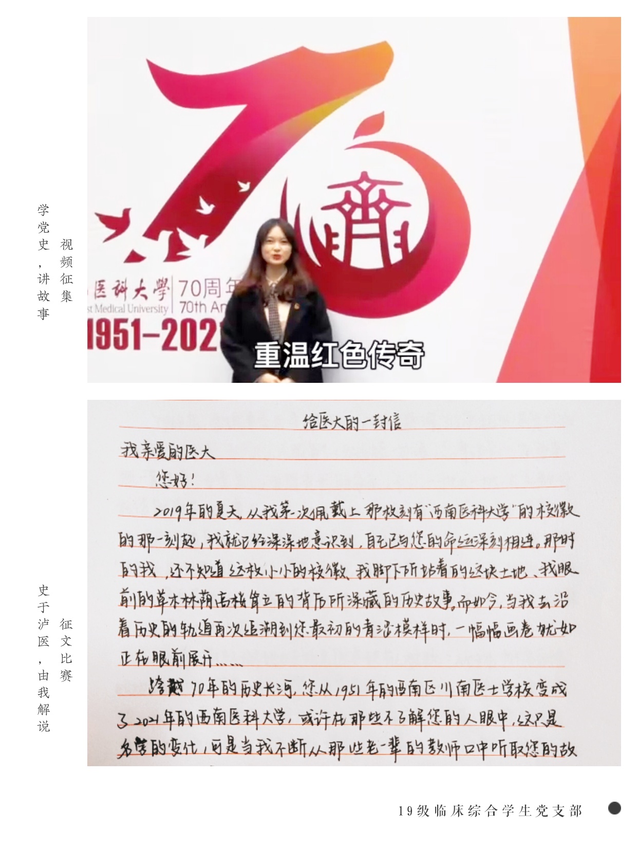 在中国共产党百年华诞与beat365官方网站建校70周年交汇之际,为进一步贯彻落实习近平总书记“以史为鉴、开创未来”的重要讲话精神,坚定当代青年学生理想信念、鼓舞其爱党爱校情怀,基础医学院2019级临床综合学生党支部于10月31日至11月30日开展了“共贺建党100周年,欢庆建校70周年”主题活动。