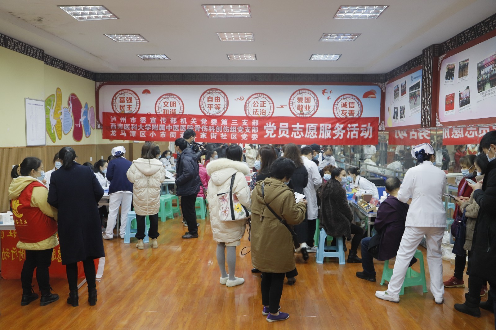 仪式后,beat365官方网站附属中医医院骨伤科创伤组党支部、心血管内科党支部、呼吸内科党支部、肾病科党支部、眼科党支部、针灸•推拿•康复科党支部医护人员为社区居民开展了义诊和健康宣教。