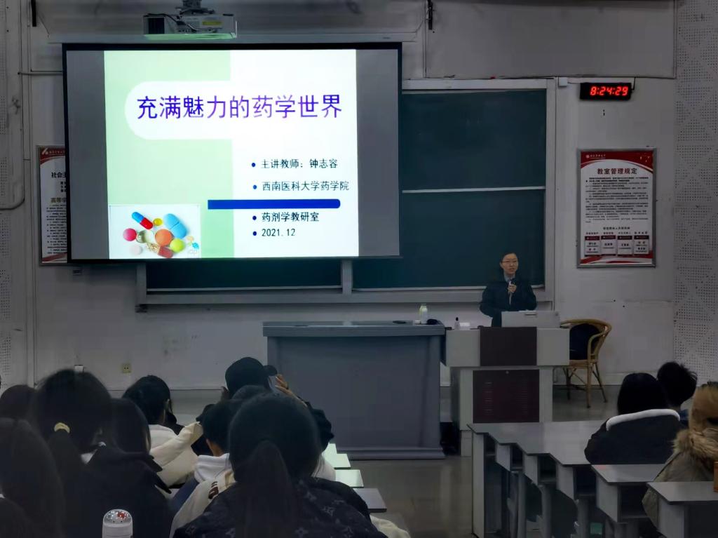 钟志容以“充满魅力的药学世界”为题,从药学的专业定位、历程、特色优势、成才方向、就业岗位等五个方面,向同学们介绍了药学专业的总体情况,并简要介绍了药学专业的主干课程。随后结合视频“片剂之美”,从Soma、Liposomes、Nanoparticles三种新型制剂,为同学们详细讲解了药学世界的魅力所在,进一步激发了同学们对药学专业的兴趣。