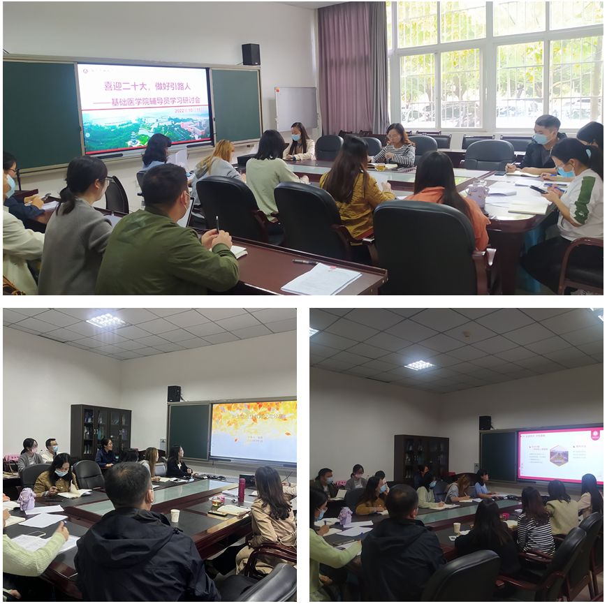 为迎接党的二十大胜利召开,进一步加强辅导员之间的工作交流,提高辅导员综合素质能力,持续推行基础医学院辅导员学习研讨制度,10月11日下午,基础医学院在鸿文楼小会议室组织召开了辅导员学习研讨会。本次学习研讨以“新生入学适应性教育”为主题。2022级一办主任刘立航,2021级临床办副主任敖爽作为主讲人,基础医学院全体专兼职辅导员、辅导员助理参会。基础医学院党委副书记、纪委书记黄钰主持会议。