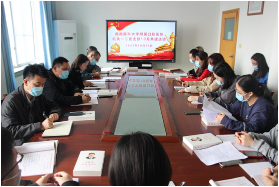 10月12日上午,附属口腔医院机关第一党支部和第二党支部在医院五楼小会议室联合开展10月支部共建活动,深入学习习近平总书记来川视察重要指示精神,开展喜迎党的二十大专题教育。两个支部全体党员、发展对象和入党积极分子参加会议。会议由机关第一党支部书记古元主持。