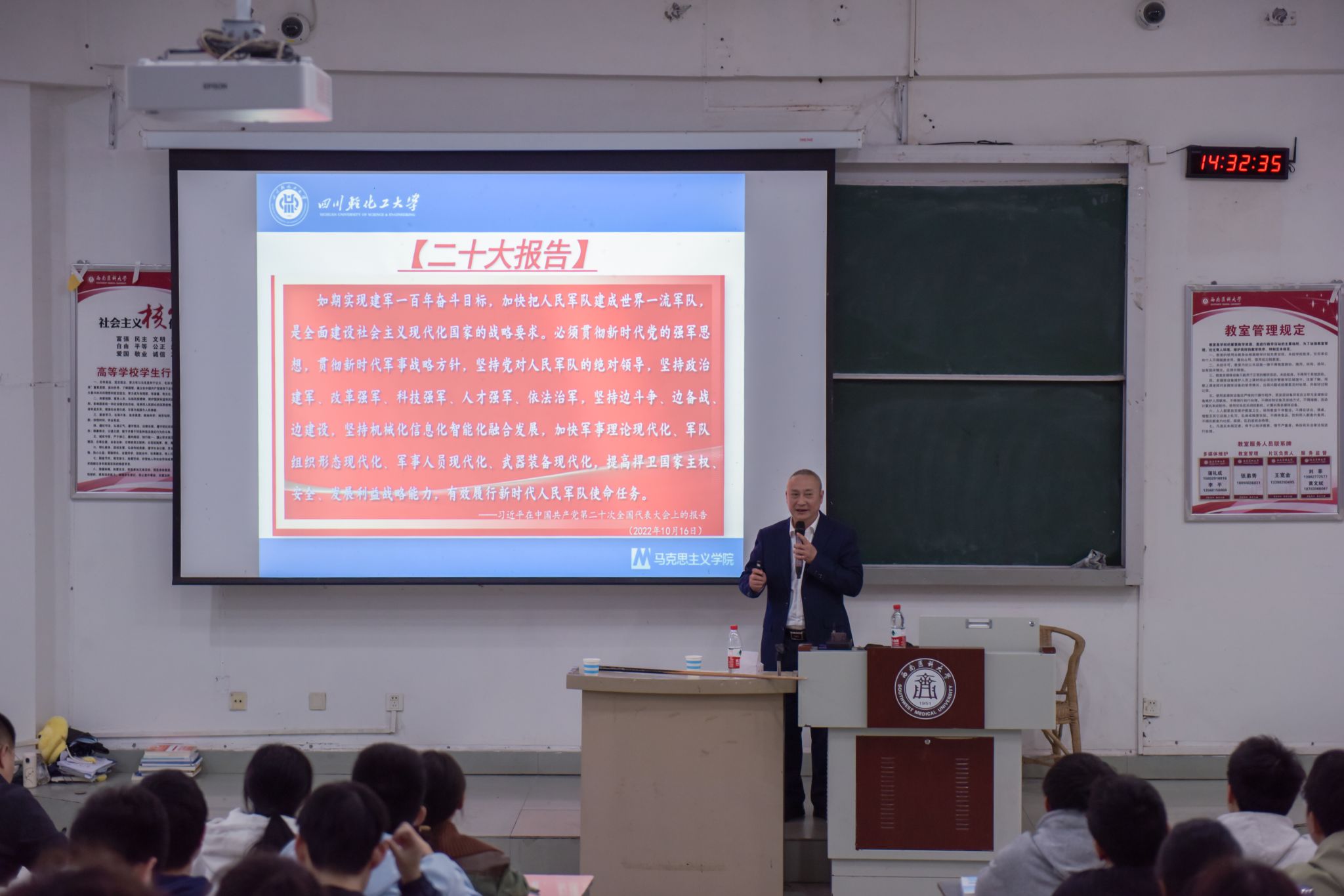 为深入学习贯彻习近平总书记关于加强全民国防教育的重要指示精神,全面贯彻党的教育方针、新时代军事战略方针和总体国家安全观,紧紧围绕落实立德树人根本任务和强军目标根本要求,深化军事课教学改革,提高军事课教学质量,推动军事课教学创新与发展,按照省教育厅统一安排,beat365官网于3月20日下午在城北校区鸿文楼开展军事课骨干教师巡回授课及教学展示活动。四川省军事课骨干教师、四川轻化工大学马克思主义学院党委副书记、纪委书记李成学教授到校授课。学校武装部·保卫处、马克思主义学院教师代表、学生代表300余人到场聆听。巡回授课活动由beat365官网马克思主义学院副院长赵微主持。