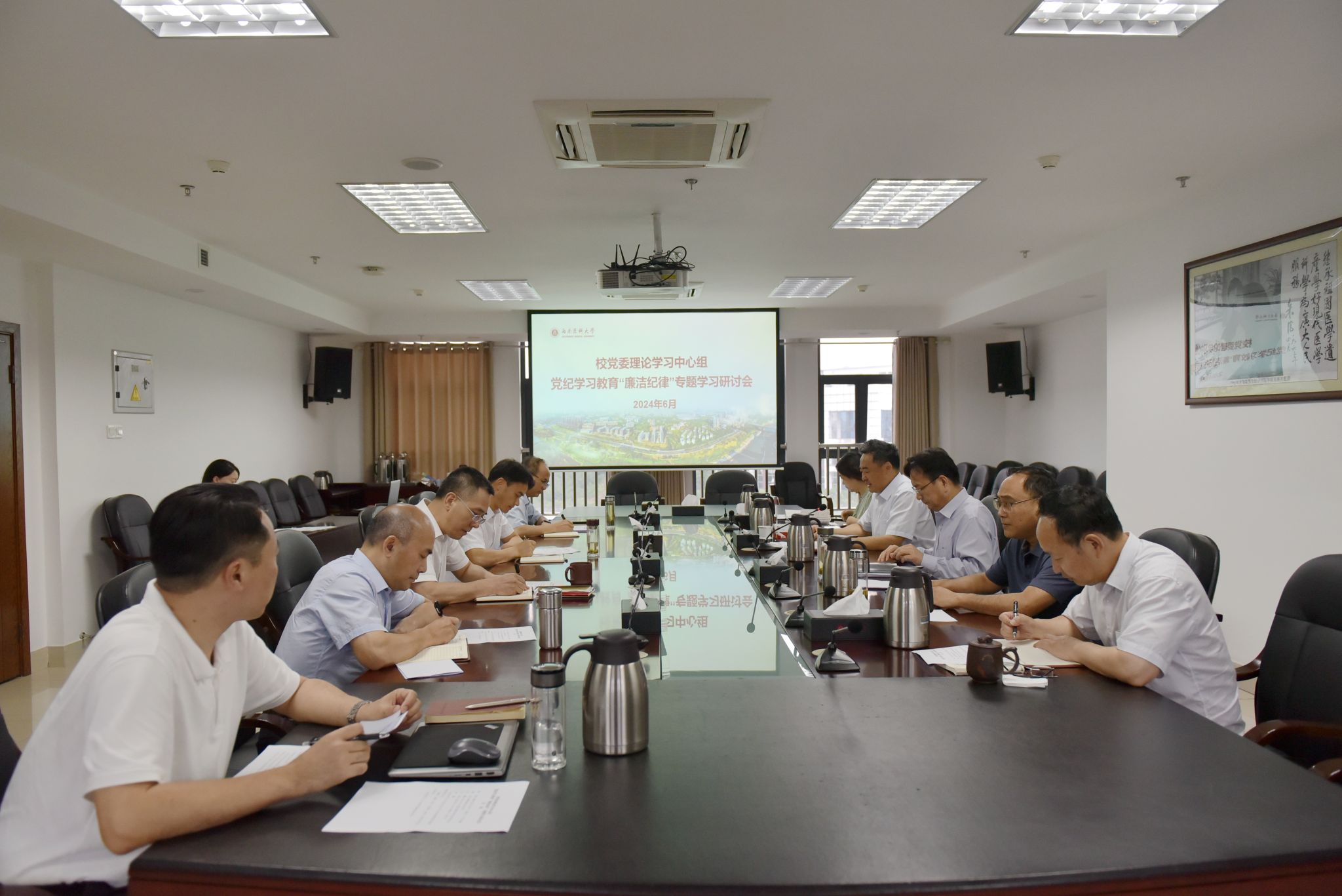 6月18日下午,学校党委理论学习中心组在城北校区德诚楼621会议室召开党纪学习教育“廉洁纪律”专题学习研讨会。学校党委理论学习中心组成员、党政办公室主任参加会议。党委书记、中心组组长廖斌主持会议。