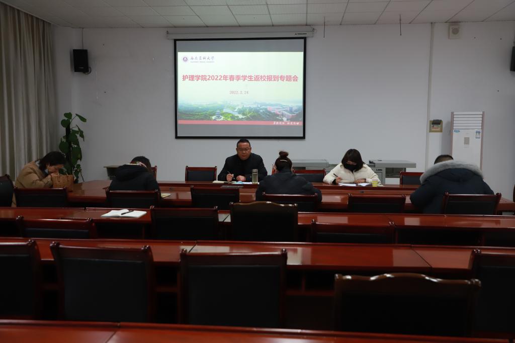 2月24日上午,护理学院在海川楼4楼会议室召开2022年春季学生返校报到专题会。学院党委副书记•纪委书记李文良,学生科科长陈晨以及全体辅导员参加会议。