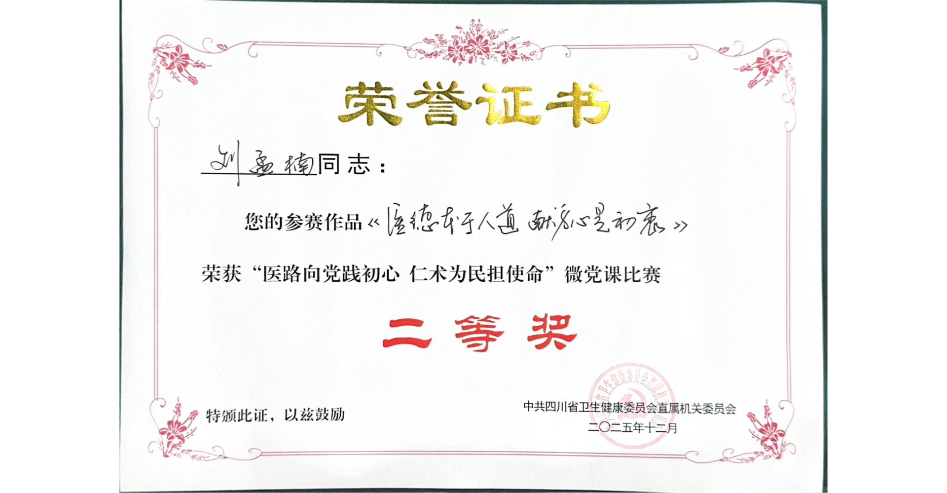 活动中,心血管内科党支部刘孟楠同志以《医德本于人道 献身必是初衷》为题讲的微党课荣获大赛二等奖。