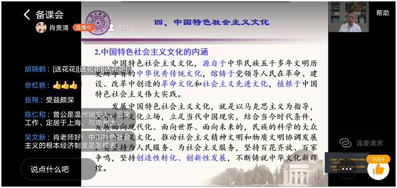 备课会结束后,概论教研室主任赵微组织全体教师在线讨论,大家积极发言,一致认为在新冠肺炎疫情还未结束的当下,利用互联网拓展备课方式的多元化,优化“互联网+教育”的实效性,此种备课形式具有积极意义。“毛泽东思想和中国特色社会主义理论体系概论”课程内容丰富,思政课教师在授课过程当中应注意教材体系向教学体系的转化,使大学生对马克思主义中国化进程中形成的理论成果有更加准确的把握,提升其运用马克思主义立场观点和方法认识问题、分析问题和解决问题的能力。