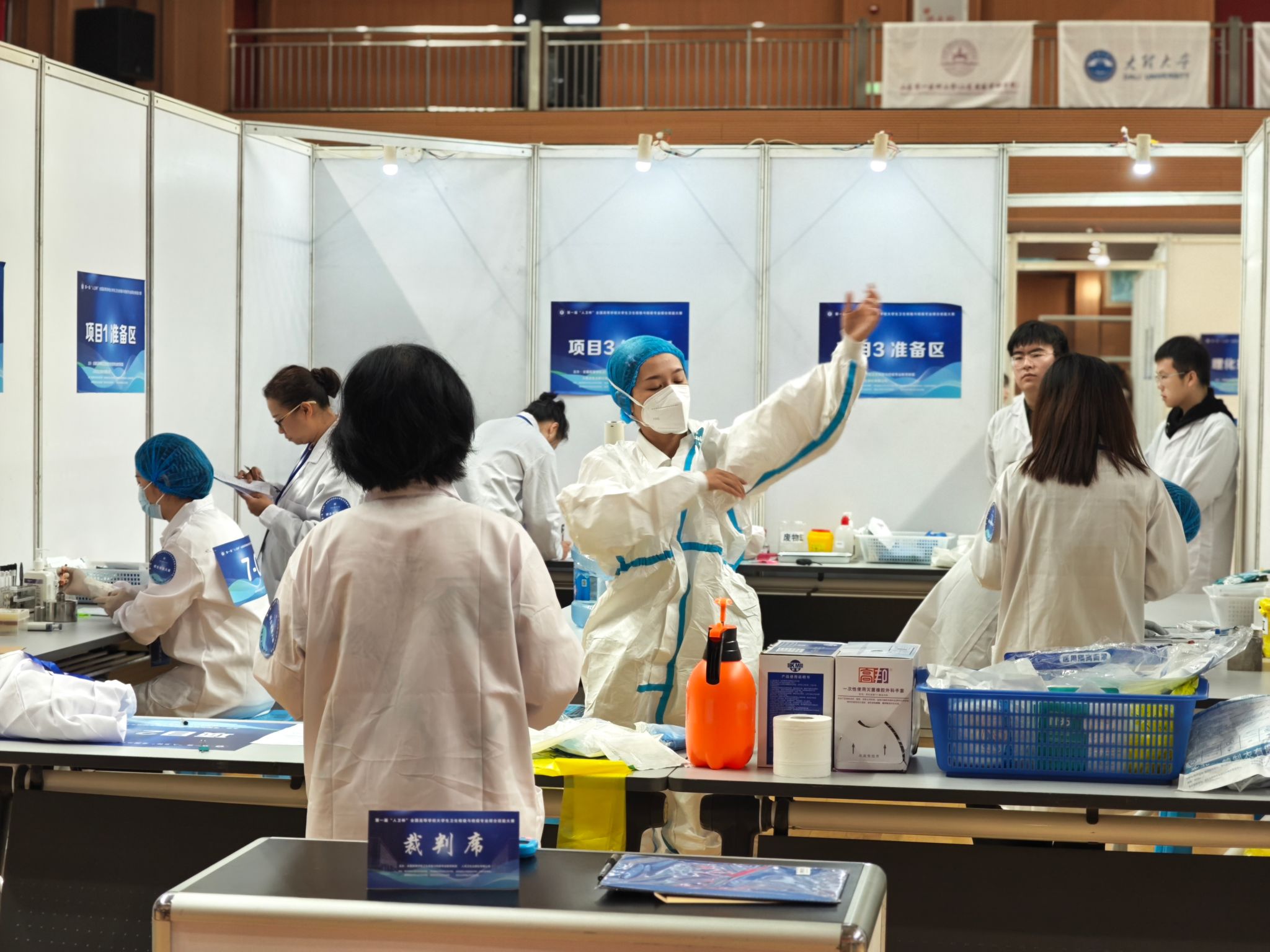 据悉,本次大赛由全国高等学校卫生检验与检疫专业教育联盟、人民卫生出版社主办,重庆医科大学公共卫生学院、河北医科大学公共卫生学院、南京医科大学公共卫生学院、南华大学公共卫生学院、温州医科大学检验医学院(生命科学学院)、四川大学华西公共卫生学院承办。此次大赛分为初赛和决赛两个阶段进行,初赛以在线网络答题、全程录像方式进行,根据团队成绩排名决出片区决赛名单,最终共遴选出24支参赛队伍进入决赛。决赛技能操作分三站进行,全部技能操作成绩直接相加得到决赛成绩。