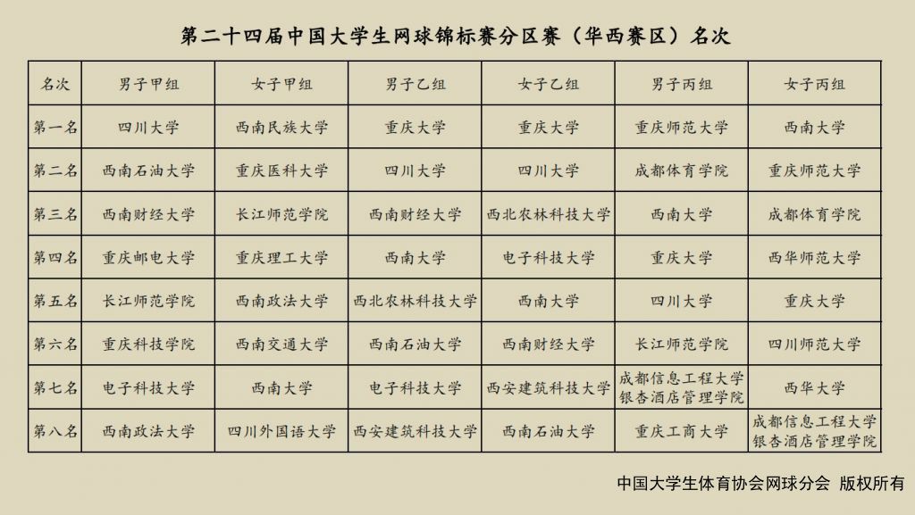 5月12日下午16:30,第二十四届中国大学生网球锦标赛分区赛(华西赛区)在泸州奥林匹克体育公园网球运动中心球场圆满落幕,32所高校近400余名运动员164个团队,经过两天时间,共完成男子、女子的甲、乙、丙六个组别的455场比赛。