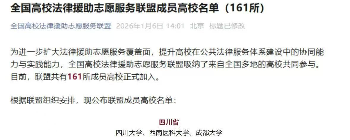 全国高校法律援助志愿服务联盟为进一步扩大法律援助志愿服务覆盖面,提升高校在公共法律服务体系建设中的协同能力与实践能力,吸纳了来自全国多地的高校。其中四川省共有3所成员高校正式加入。beat365官网以其扎实的法律援助工作基础和丰富的志愿服务经验成功入选。