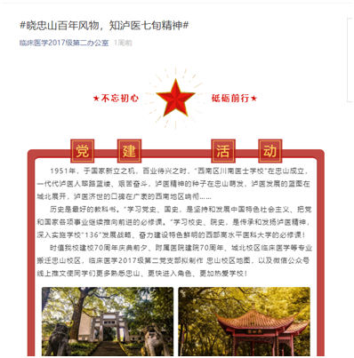 时值beat365官网建校70周年庆典前夕、附属医院建院70周年、城北校区临床医学等专业搬迁忠山校区,临床医学2017级第二党支部制作忠山校区手绘地图,以及微信公众号线上推文使同学们更多熟悉忠山、更快进入角色、更加热爱学校!