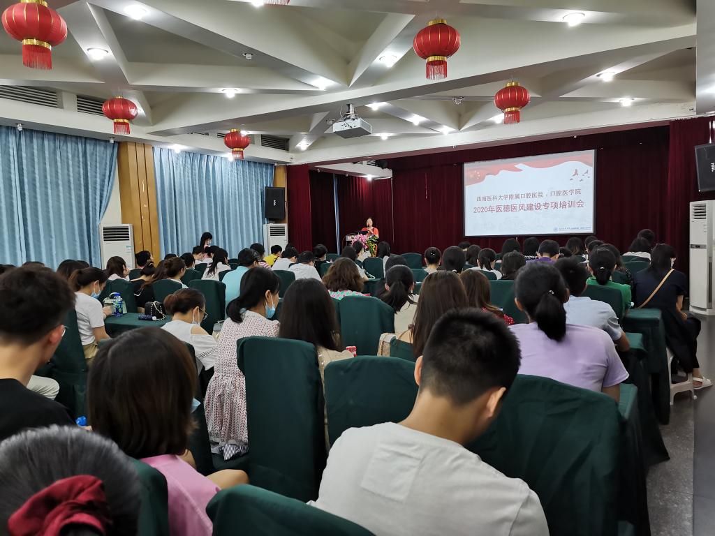 为进一步加强医务人员医德医风建设,规范依法执业、廉洁行医行为,按照国家卫生健康委《2020年医疗行业作风建设工作专项行动方案的通知》和省、市卫健委相关要求,7月30日晚,附属口腔医院在附楼多功能厅举办专题培训,全院医、技、护人员和“四生”参培,培训由附属口腔医院副院长郭玲主持。