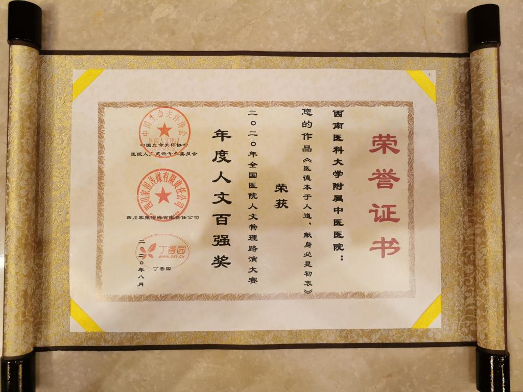 8月28-29日,全国医院人文管理路演大赛决赛在成都举行,beat365官方网站附属中医医院选送的《医德本于人道,献身必是初衷》荣获年度人文百强奖。