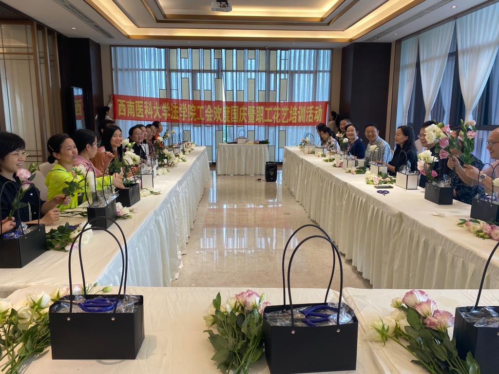 9月28日下午,法学院工会在天誉誉府活动厅举办了欢度国庆职工花艺培训活动。法学院领导班子及部分教职工参加了此次活动,活动由法学院党总支副书记、工会主席黄莉主持。