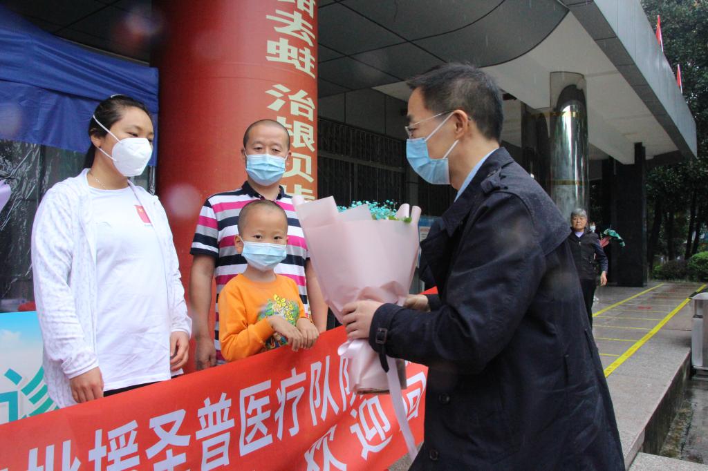 随后,援外队员回到医院,党委书记代天祥、副院长郭玲、医院相关职能部门和临床科室负责人在医院迎接,并在医院2号楼停车场举行简约而隆重的欢迎仪式,由代天祥主持。欢迎仪式严格遵照新冠肺炎疫情防控的“地点空旷、人数控制、间距拉开”的要求进行。