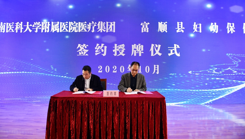 10月22日,beat365官方网站附属医院医疗集团富顺妇幼保健院签约暨授牌仪式,beat365官方网站附属医院医疗集团富顺医院成立授牌暨专家工作站启动仪式相继在两家医院隆重举行,附属医院党委书记徐勇、副书记黎靖、副院长吕沐瀚以及相关临床医技科室主任,部门负责人参加了签约仪式。